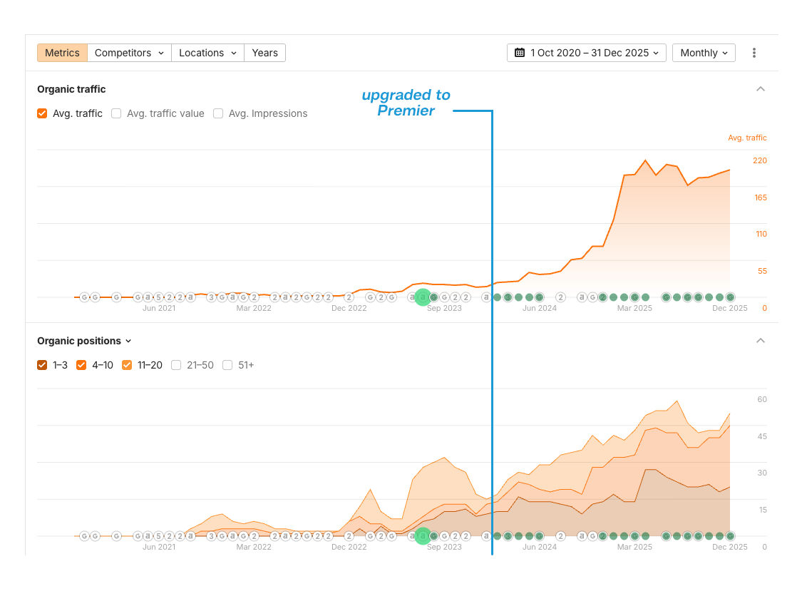 The shift to Premier more than doubled the pace of growth by layering expert content, SEO, and a structured lead strategy on top of an already strong foundation. With these systems now in place, the client is positioned to scale faster while compounding long-term authority, trust, and inbound demand in their market.